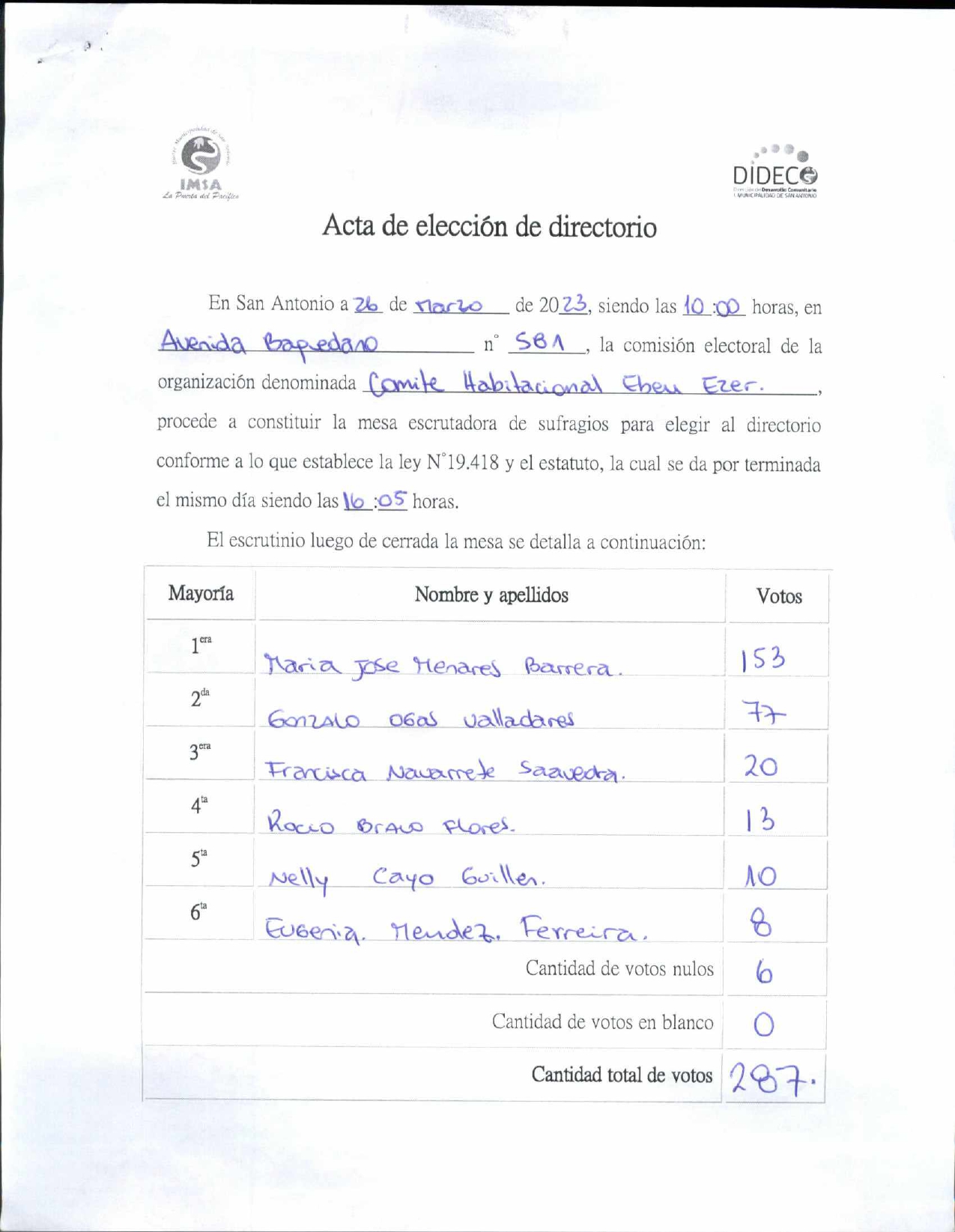 Acta de elecciones "Comité Habitacional Eben Ezer"