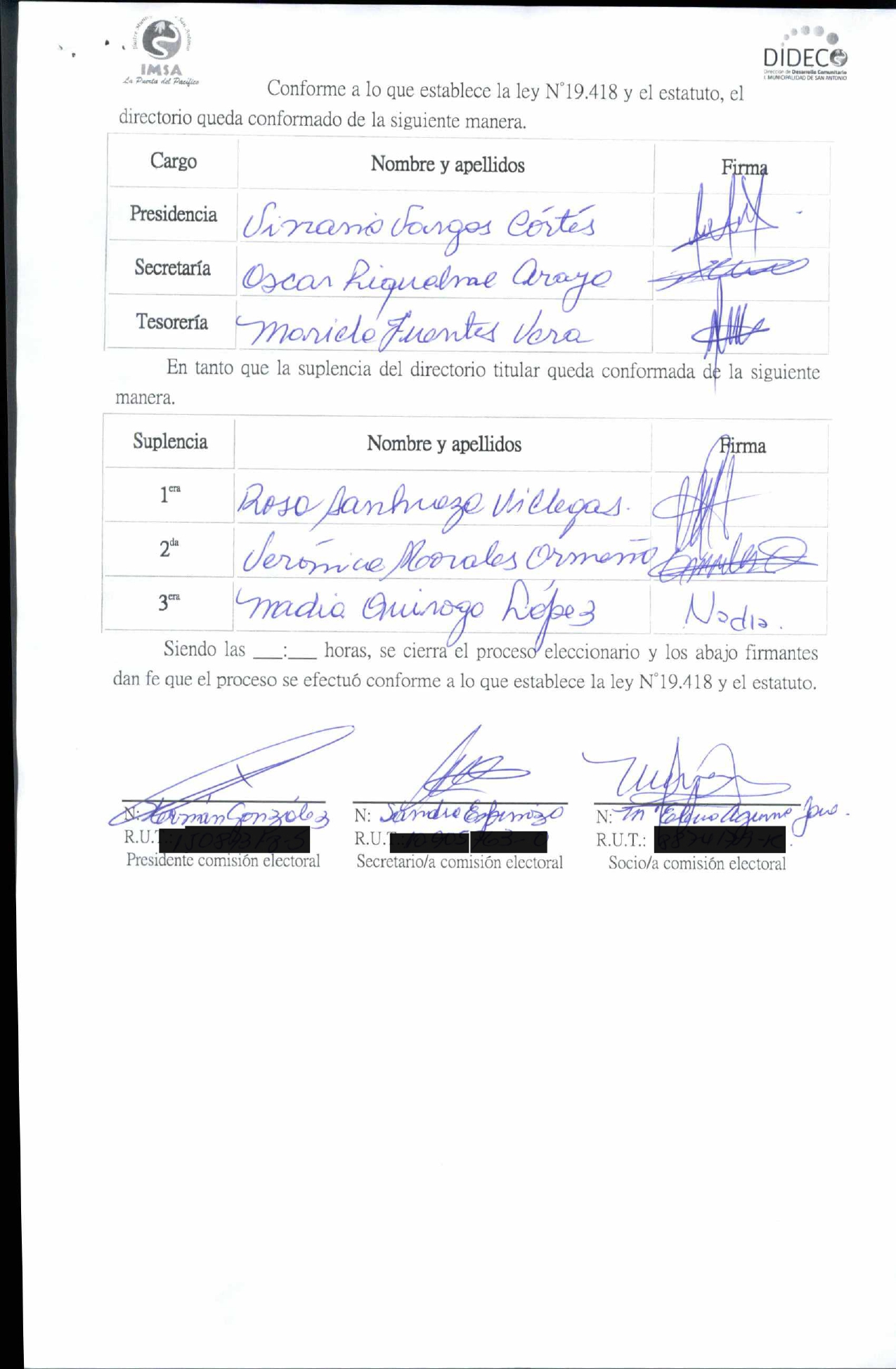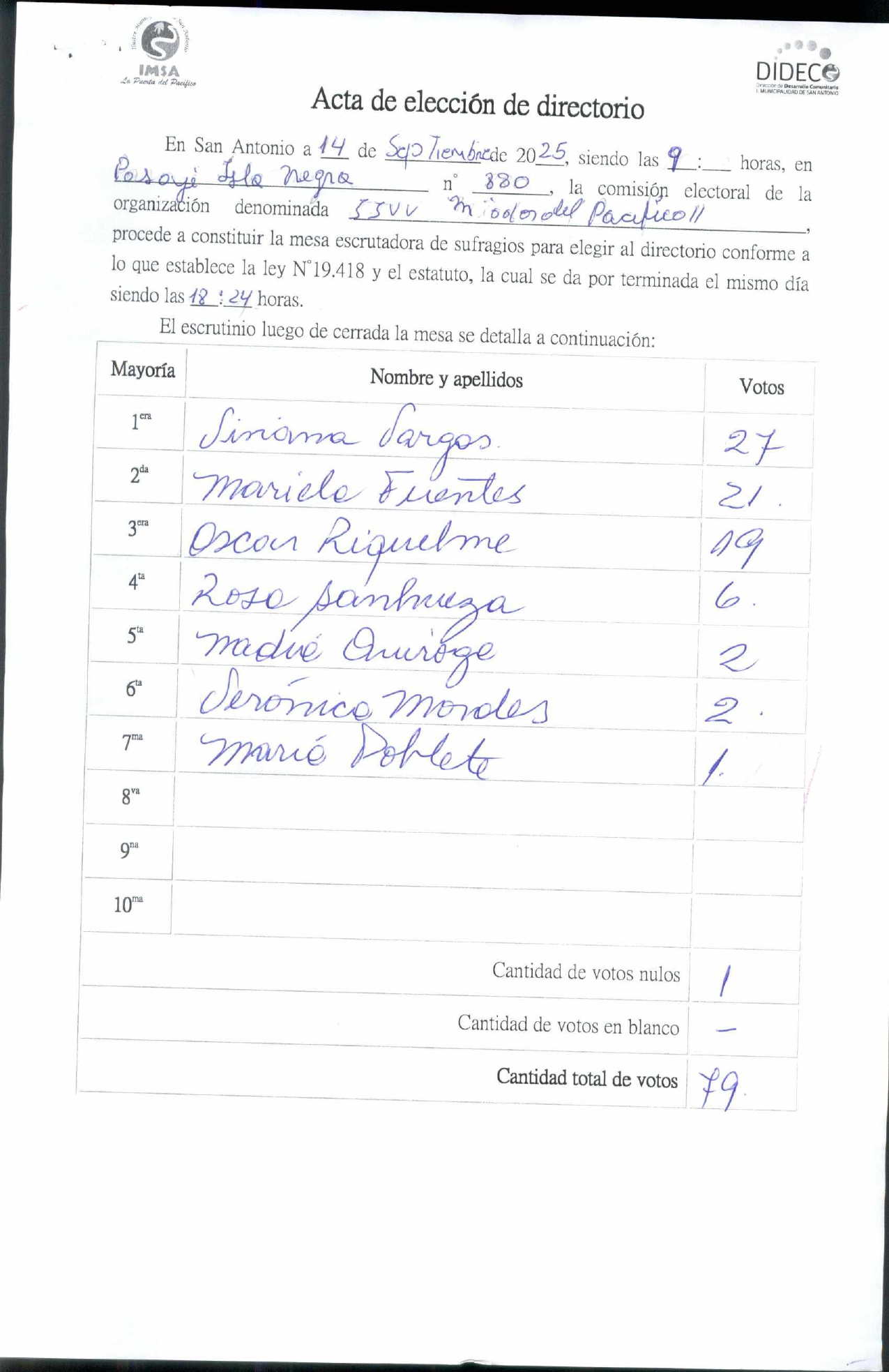 Acta de elecciones JJVV VILLA MIRADOR DEL PACIFICO II