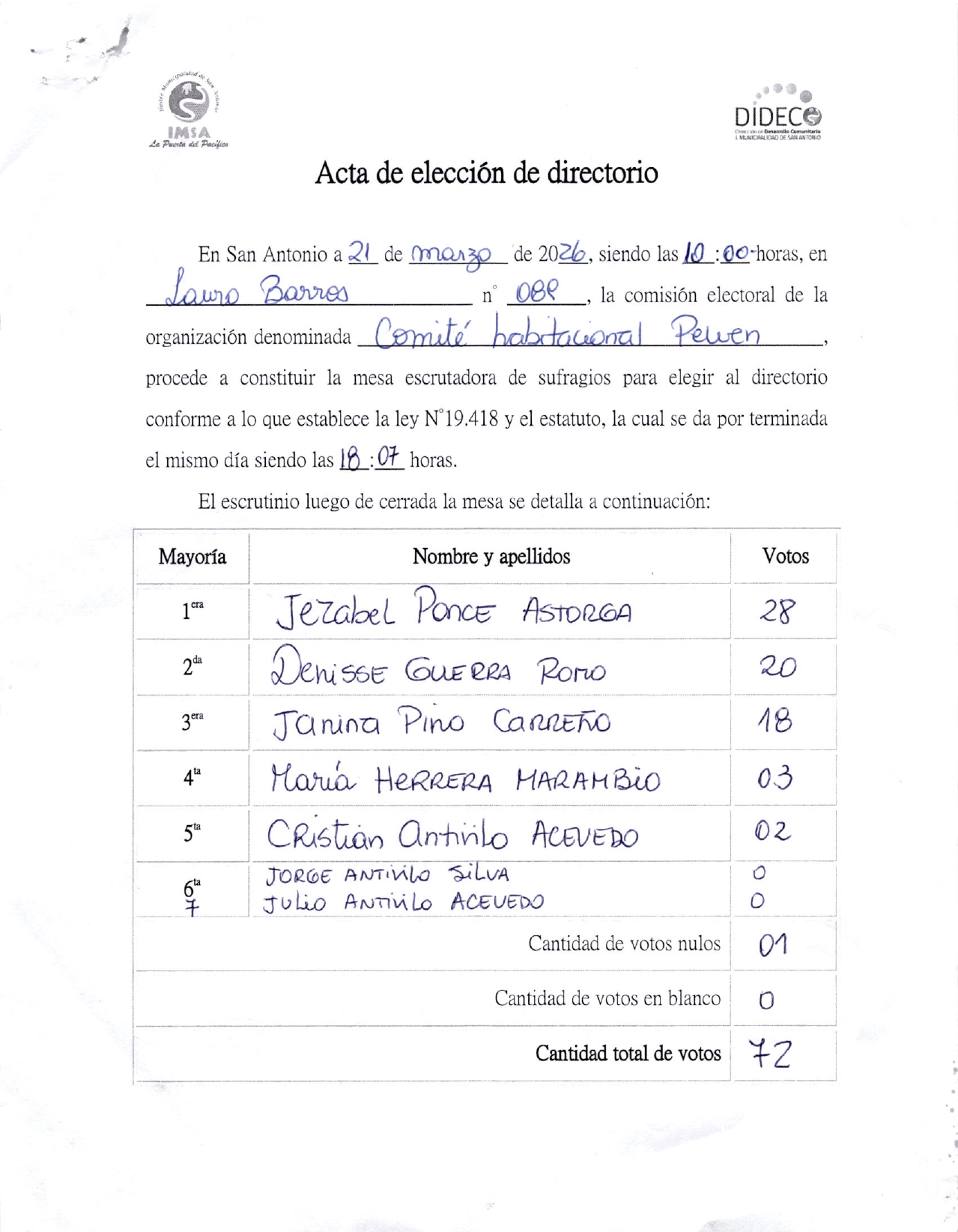 Acta de elecciones COMITE HABITACIONAL PEWEN CC