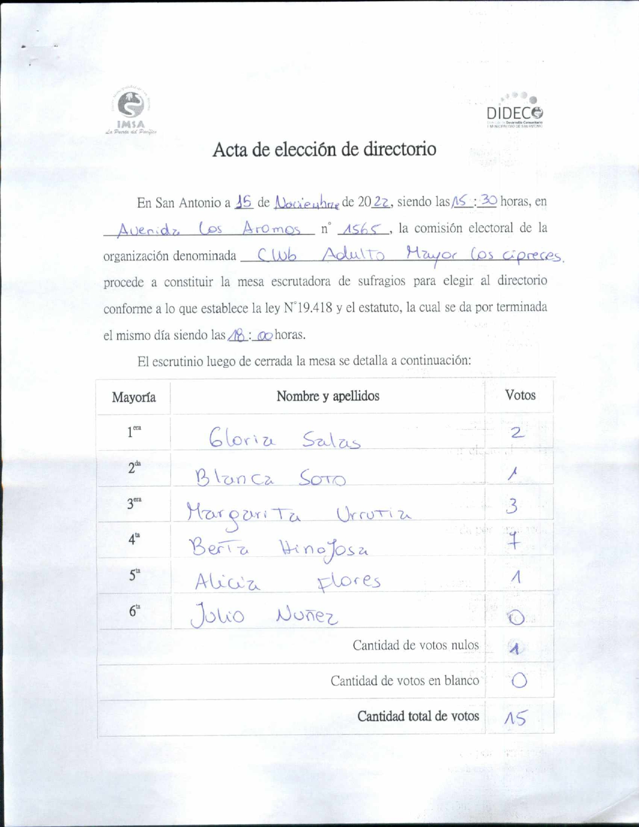 Acta de elecciones "Club Adulto Mayor Los Cipreses"