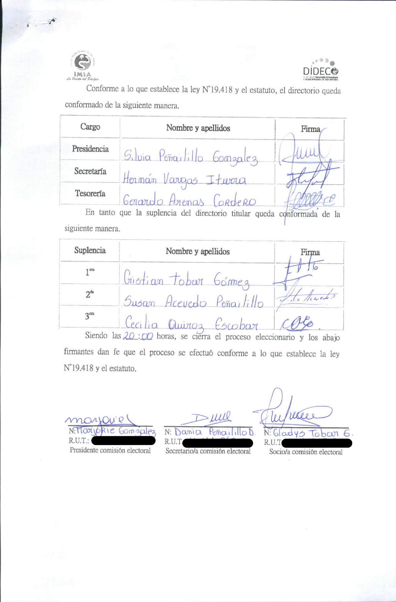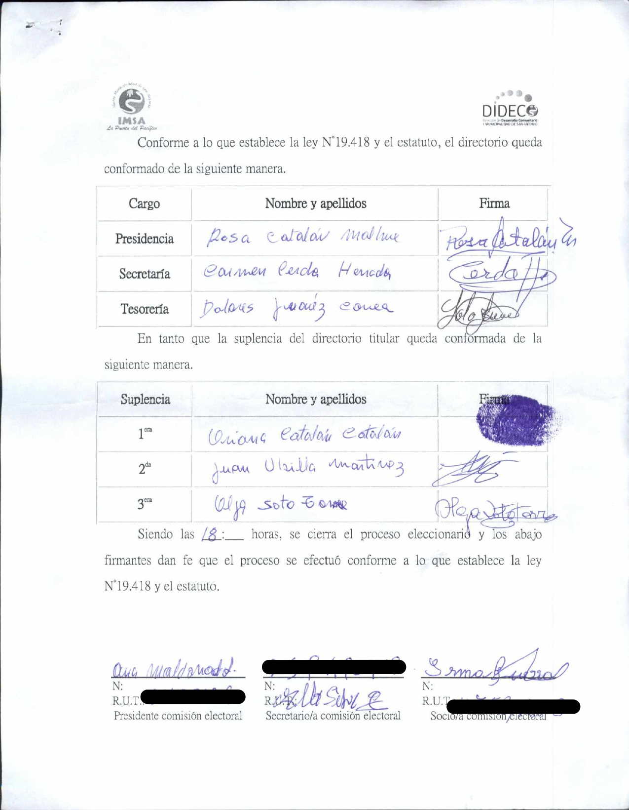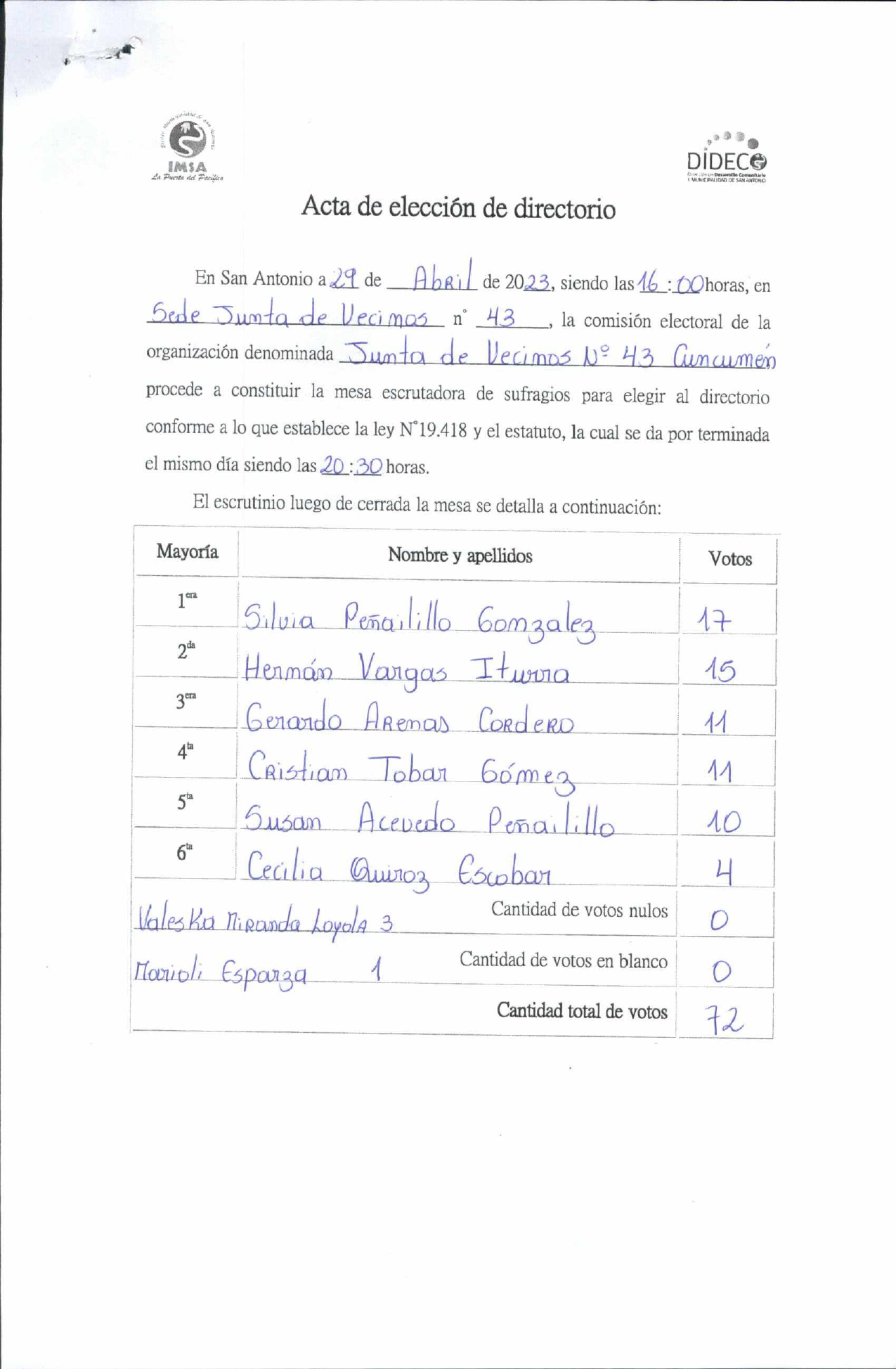 Acta de Elecciones "JJ.VV CUNCUMEN"